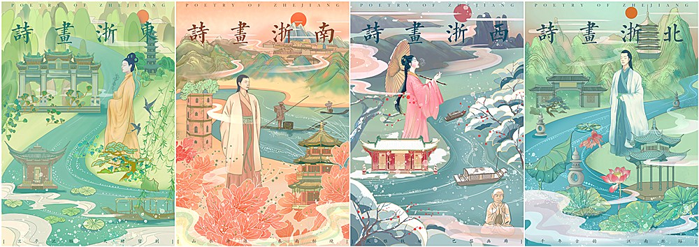 四张作品分别展示四条文化带的地域文化特色,并表达了浙江春夏秋冬江南的不同景色。在海报的表现上,以插画的形式为主,造型表现提炼了诸多江南建筑,使现代的表现技法与传统的东方美学完美结合,体现诗人笔下四季如画的浙江。