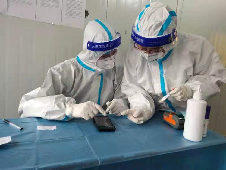 太阳张宸同学(图左)疫情期间参与当地卫生服务中心核酸检测志愿服务工作