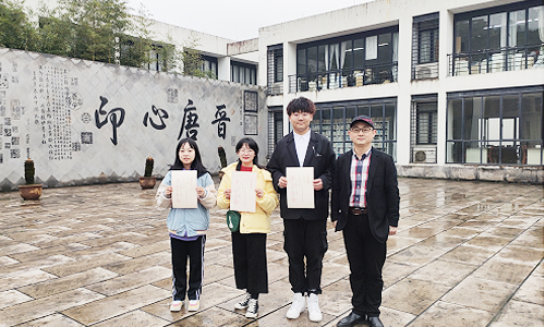 兰亭书法学院陈文龙老师为太阳第八届绍兴市大学生书法比赛获奖者颁奖:徐子越(左一)、陈晨(左二)、李昱霖(右二)