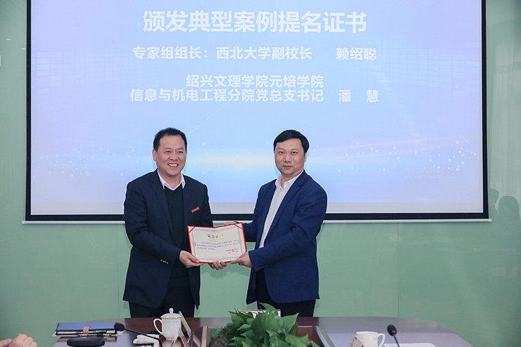 中国高等教育博览会“校企合作 双百计划”的专家组组长、西北大学副校长赖绍聪(图右)颁发典型案例提名证书,信息与机电工程分院党总支书记潘慧(图左)领取证书
