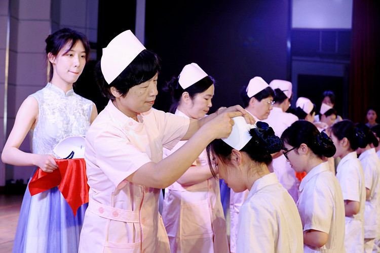 仪式上,参赛代表队从仪容、仪表、站姿、坐姿以及拾取物、端治疗盘、持病历夹、推治疗车等不同方面,对护士礼仪风采进行精彩展示。叶访春为8位获评最美护生的考研成功者、就业先进者、优秀党员和学生干部颁奖。在授帽环节,伴随着悠缓的乐曲,台上护理前辈们带着殷殷嘱托,依次为同学们授帽;台下分院相关教师为2018级护理专业学生点灯,烛光与灯光交相辉映,场面庄重而神圣。一顶燕帽,不仅联结起浓浓的师生情,更传递出努力与坚持,寄托着对白衣天使们未来的期许与希望。戴上燕帽,全体同学在优秀校友、浙江省先进护士金婷婷的带领下庄严宣誓,并认真聆听她的学习工作经验和体悟。