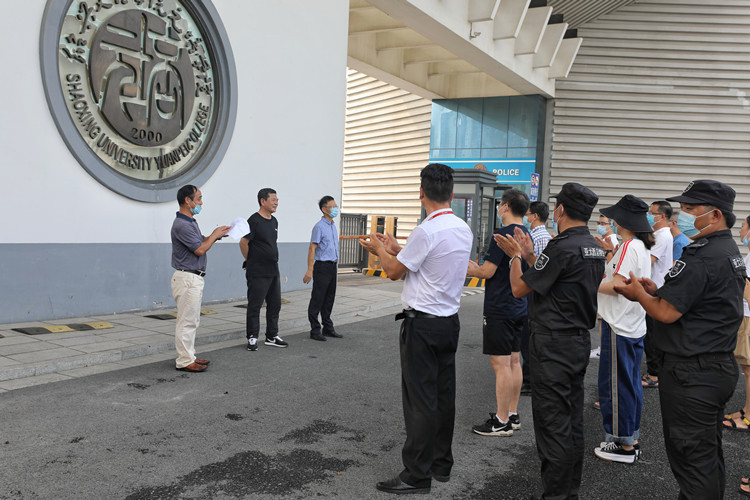 9月3日下午,学院在西大门举行2021年秋季开学疫情防控应急处置演练。学院党委书记叶访春、院长沈红卫出席,演练由副院长周思红主持,办公室、学工部、团委、保卫处、基建后勤处等相关部门负责人,各分院书记(副书记)、全体辅导员、学生代表、医务工作人员等参加演练。