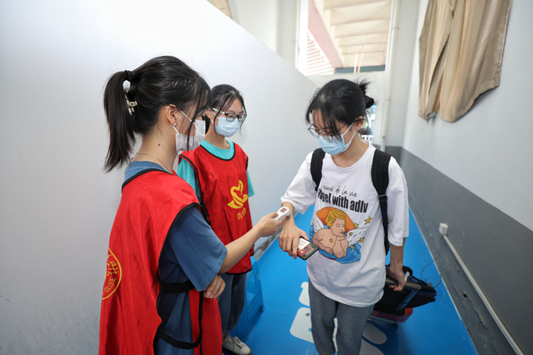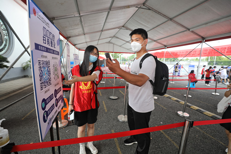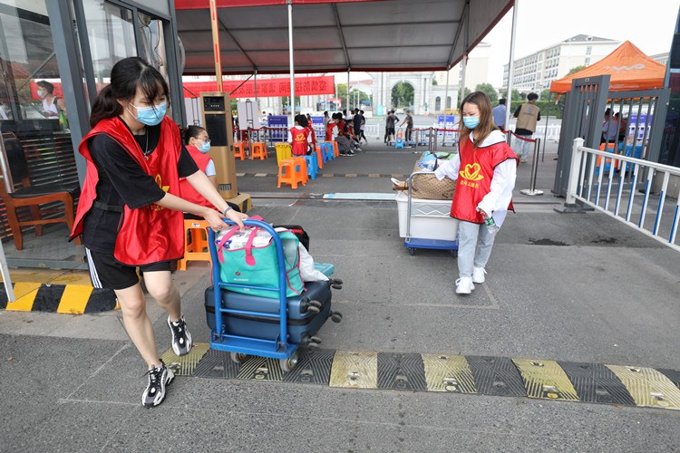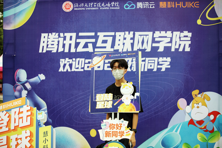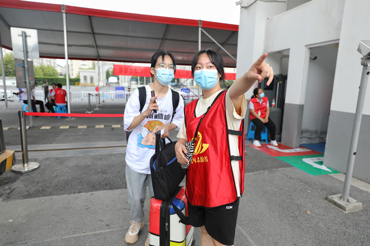 “同学,行李由志愿者负责,请往这边走,先扫码,再更换口罩,最后进行测温。”另一边,热情的“红马甲”坚守疫情防控职责,有序引导新生进校。“来,一二三!”进校后,在志愿者的带领下,“萌新”们首先来到院训石前合影。这不仅意味着大学生活的开始,更是学院对每一位新元培人传承“进德修业”院训精神的殷切期望。