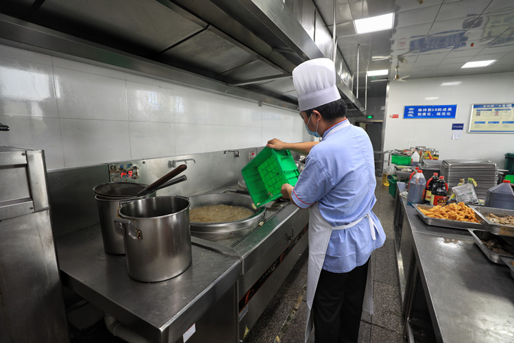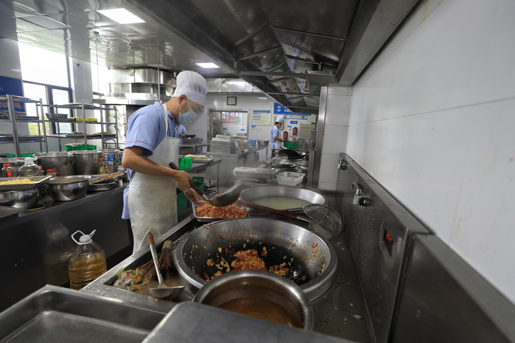 兴越楼、群贤楼食堂后厨提前部署,细化分工,从早晨便火热准备,全力为新生开好“第一餐”。洗菜备菜、起锅烧油、倒入食材、下料调味,把握好火候,一锅锅香飘四溢的美味佳肴新鲜出炉。餐厅内一盘盘搭配精致、口感丰富、物美价廉的菜肴和可口的热汤供新生自行选择,新生们结伴围坐成一桌用餐,一筷一勺,送入口中是美味,化在心头是温暖。
