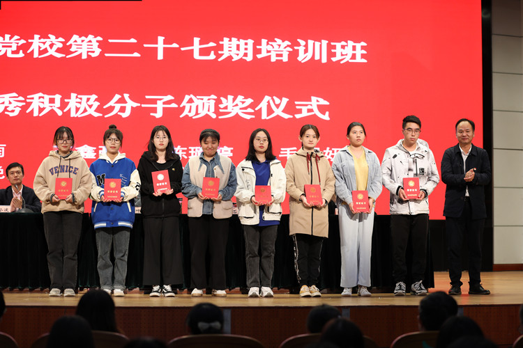 开学典礼在庄严的《国际歌》中拉开帷幕。大会宣读了第二十六期预备党员、入党积极分子培训班结业文件和优秀学员名单。石旭明为优秀学员代表颁发荣誉证书。第二十六期预备党员优秀学员代表李珂静、第二十七期入党积极分子学员代表段泽成先后发言。