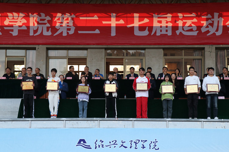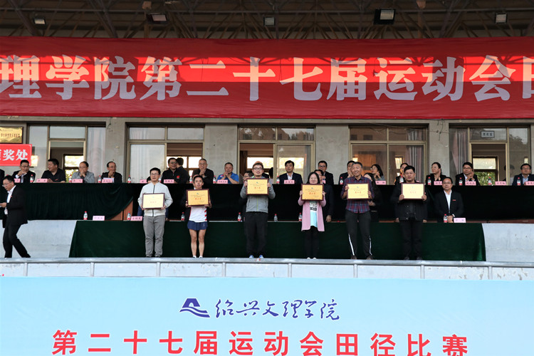 太阳荣获教工团体总分第三名,运动员代表赵沭明(左二)上台领奖