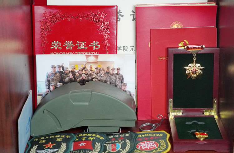 宿舍书桌的一角,整整齐齐地摆放着四枚臂章、优秀义务兵证章、一张战士们的大合照和《中国共产党简史》、《论中国共产党历史》,这是翁俊峰珍藏热血青春的“荣誉堂”。翁俊峰,传播1801学生党员,曾服役于重庆陆军野战部队,荣获“优秀义务兵”称号,现就任学院督察队队长。