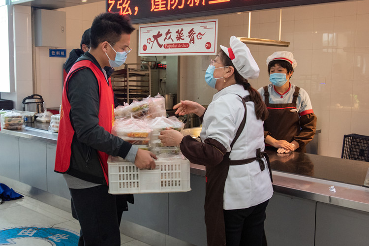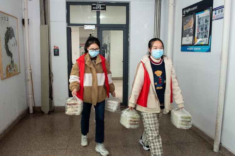 此外,还有一批累计服务人数超过300人次的志愿者队伍,早、午、晚三餐为隔离点的同学送餐上门。“那天下着小雨,看到两个女生毫无怨言地扛起装着满满餐盒的篮筐,手上还提着一袋,心里很是感动。”志愿者工作负责人感叹道。“大家穿梭在校园南北区寝室楼,拎着暖乎乎的饭菜在楼层间来回往返。饭菜挺重的,有时候也会疲惫,但是听到同学们一声声‘谢谢’,感觉自己做的都值得。”志愿者、翻译2001金梦婷说。