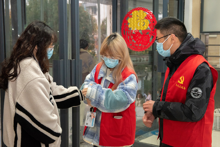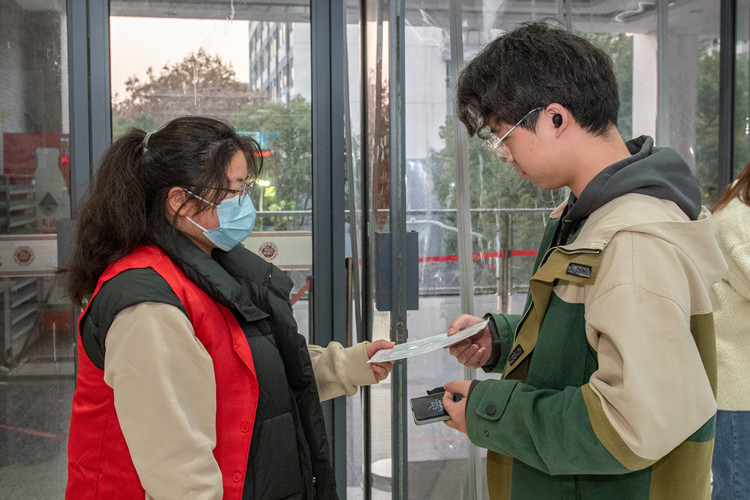 12月13日、16日,学院启动两轮全员核酸检测工作。当天中午,百余名学生志愿者组成的队伍立刻集结起来,参与防疫工作培训。如何使用测温仪?如何进行信息登记?如何注册相关APP……志愿者们专注地倾听着每一条注意事项,并将要点牢记在心。“同学,请间隔一米排队等待。”“请出示健康码!”16条采样通道上,测温、登记、放行,测温、登记、放行有序进行,红色的身影来来回回走动着,从未离开。同样的动作重复了成百上千次,繁复的工作持续近10个小时。