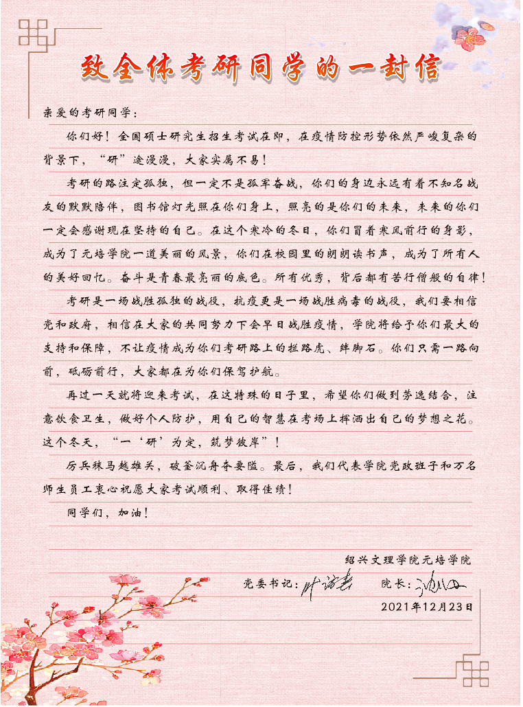 学院党委书记叶访春、院长沈红卫亲笔致信考研学子