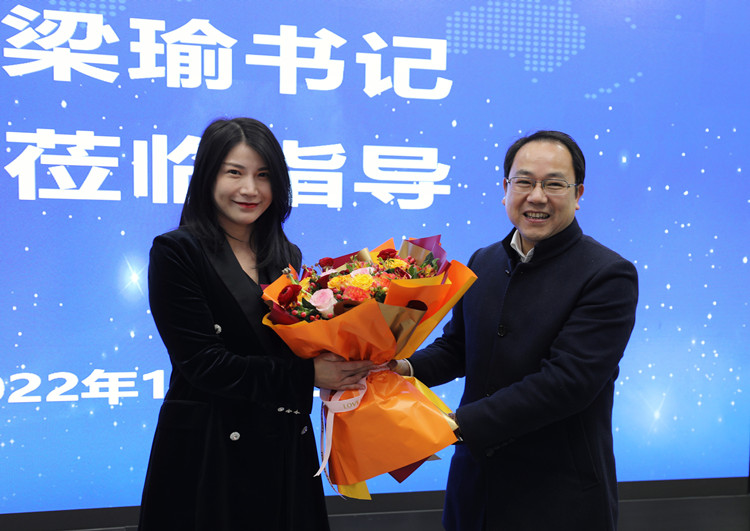 学院党委书记梁瑜(右)代表学院向东盟经济研究院副院长、图胜科技总裁吴代君(左)献花并送上新春祝福