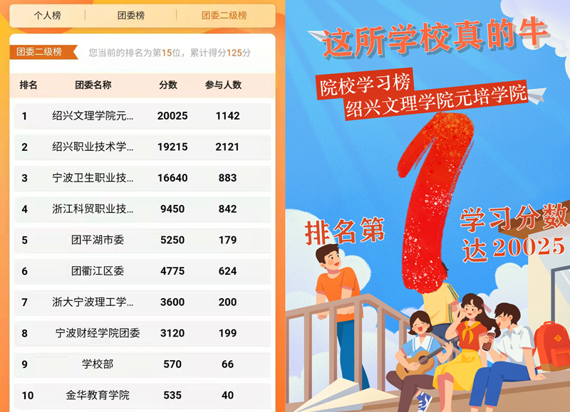 “‘浙里潮音’开始了吗?”3月23日,由团省委、浙江日报报业集团联合主办的“浙里潮音”浙江省青少年线上学习平台第三季大学习活动拉开帷幕。平台上线第一天,元培学子首日学习分数高达20025分,再次位居全省高校榜首位。