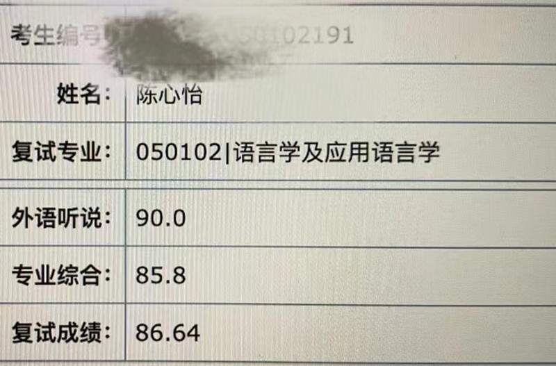 得知自己初试成绩仅仅超过北京外国语大学自划线两分,陈心怡悬着的心迟迟放不下,“我想要再努力冲一冲复试,为自己的梦想‘赌’一把。”面对复试,陈心怡重新拾起备战考研时厚厚的笔记,在有限的时间里面仔细地填补着知识漏洞:搜集当下热门网络用语,用语言学知识解释语言现象,尽可能搜集往年复试真题并反复练习......在复试时我抽到的一个考题回答的并不是很好,有些乱了阵脚,好在现场评委老师们耐心地一步步引导我,在他们的帮助下,还算发挥出了自己最好的实力。