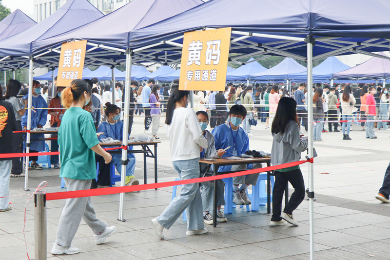 从6点30分开始,全院师生及留外楼教职工家属按照时间安排,按时、有序、错峰进行检测。“本次全员核酸检测时间紧、任务重,共安排16支检测队伍,设置普通学生检测通道、教职工检测通道和‘黄码’师生检测通道,合理划分等候区、测温区、采样区、隔离区,并组织师生排队扫码登记,20人一组至采样区进行采样。”基建后勤处相关负责人介绍,为配合疫情防控工作需要,方便因涉校园周边疫情赋“黄码”人员就近检测,学院特设立两条“黄码专用通道”,避免人员交叉感染。