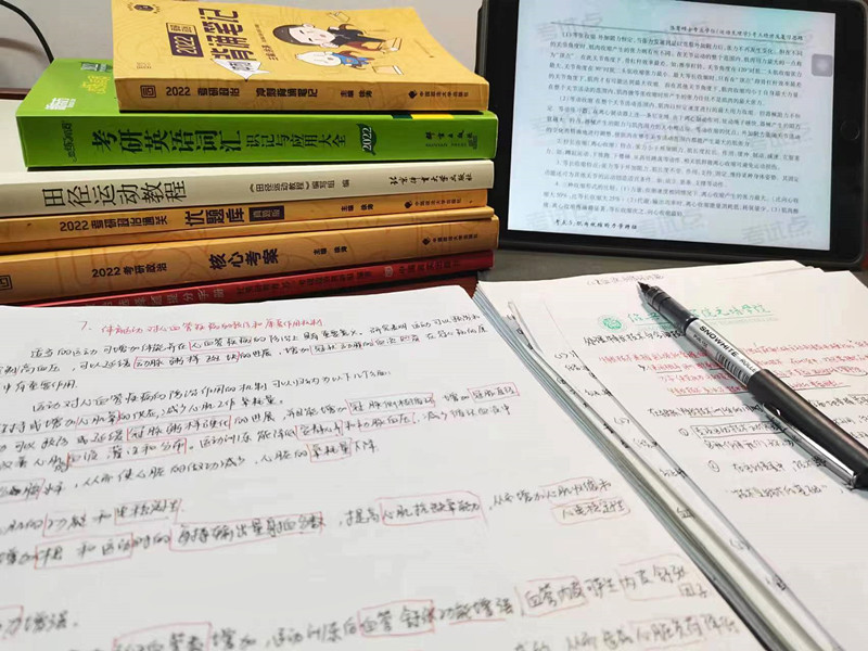 考研初试要过的第一关便是理论考试,这对牛松彪来说并不容易。“入营两年,专业课学习暂停,加上本身基础薄弱,选择考研后,我既要完成学期学业任务,又要把落下的课程抓紧补上,只能利用空余时间进行体育理论知识的学习。”