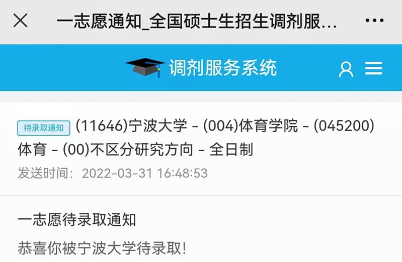“两年的当兵经历潜移默化影响着我,教会了我坚持,让我从遇到困难便会退缩转变为勇敢地迎难而上,也是有了这份经历,让我更加理解‘坚持不懈’这四字的意义。这是我考研路上的‘引航灯’,更是我人生中重要的收获。”从开始向学长学姐学习备考经验,到成功收到宁波大学体育录取通知,牛松彪长达一年的奋战终于收获结果。