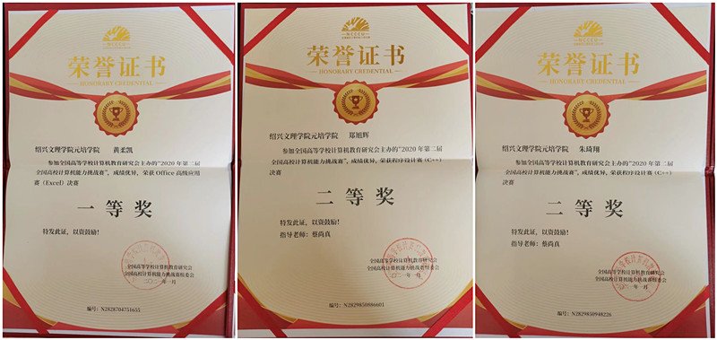 (3)学科竞赛成绩斐然,在机器人竞赛、程序设计竞赛、网络与信息安全竞赛、物理创新竞赛中优势明显,处于省内同类院校前列。2018-2020年获国家一等奖3项、二等奖1项、三等奖4项;省一等奖5项、二等奖11项;连续七年获得绍兴市大学生计算机技能竞赛团体一等奖。