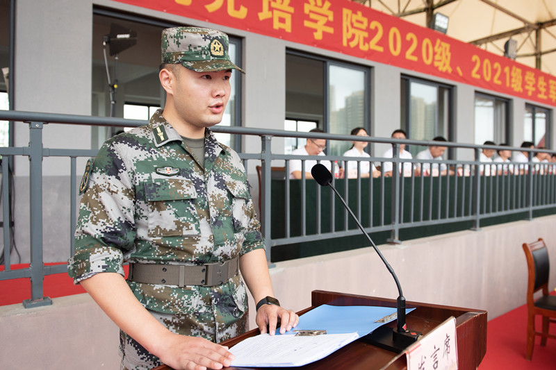 军训团教官代表秦哲青表示,全体承训教官将做到指导传授到位、口令指挥到位、人格影响到位,发挥人民军队的优良本色,用良好的品质、作风影响学生,圆满完成训练任务。