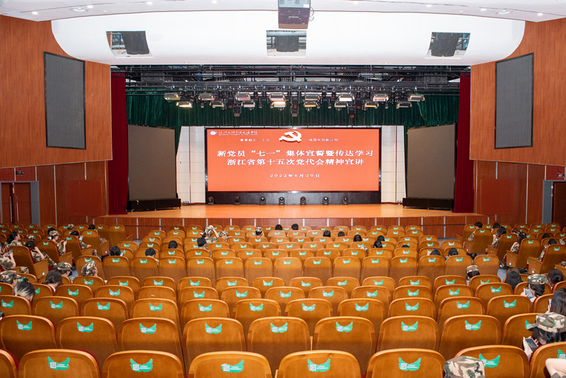 为庆祝中国共产党成立101周年,回顾党的光辉历程,讴歌党的丰功伟绩,激励广大新发展党员牢记初心使命,坚定为共产主义事业而奋斗终身的信心和决心,6月29日晚,学院在国际文化交流中心报告厅举行新党员“七一”集体宣誓暨传达学习省第十五次党代会精神宣讲活动。院党委书记梁瑜带领全院2020级预备党员集体宣誓,并作《学习贯彻浙江省第十五次党代会精神,做一名新时代合格党员》专题党课。院党委副书记、纪委书记俞国芬主持活动。
