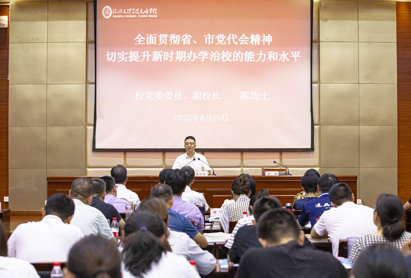 8月25日上午,学院学习贯彻省第十五次党代会精神专题培训班暨2022年暑期干部教师读书班在图书馆828会议中心正式开班。校党委委员、副校长陈均土作《全面贯彻省、市党代会精神 切实提升新时期办学治校的能力和水平》专题讲座,院党委书记梁瑜作开班动员报告,院党委副书记、纪委书记俞国芬介绍并部署学习安排,学院全体党政领导班子成员,主管及以上全体干部参加开班仪式。开班仪式由院长沈红卫主持。