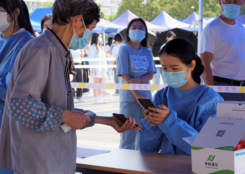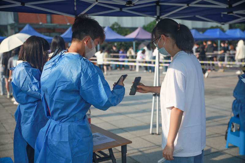 “学院一直以来十分重视疫情防控工作。作为新时代青年,我们理应积极为学院和社会奉献我们的‘青春力量’。”学生志愿者、法学2003班滕泽骞说道。“我负责扫码、录入信息,操作虽然比较简单,但仍需高度专注,不能出现任何顺序上的错误和纰漏。”党员教师志愿者徐丹宁说道。来自中语2201班的蔡心怡谈起在学院参与全员核酸“初体验”:“从昨天下午收到核酸检测通知,到今天早晨完成核酸采集,每一个步骤、流程都秩序井然,多个采集通道的开设,也大大提高了采集效率,令人安心又暖心。”药学2001班郑安琪表示,新学期开学,疫情防控很关键,作为学生,既要积极配合做好常态化核酸检测,又要做好个人防护,让自己安心的同时也让学院放心。