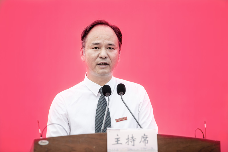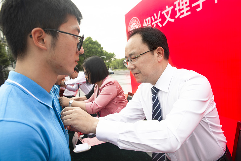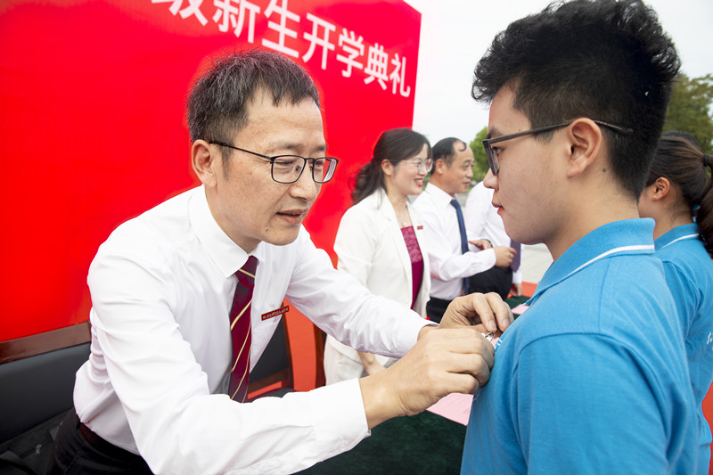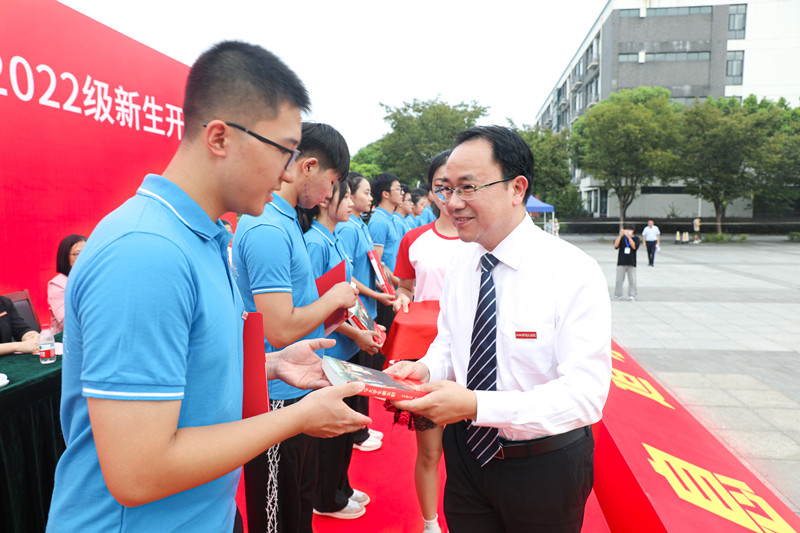 院党委书记梁瑜向新生代表赠送《习近平与大学生朋友们》。全体院领导为新生代表佩戴校徽。院长沈红卫致辞,向2022级新生的到来表示热烈欢迎。院党委副书记石旭明主持开学典礼。