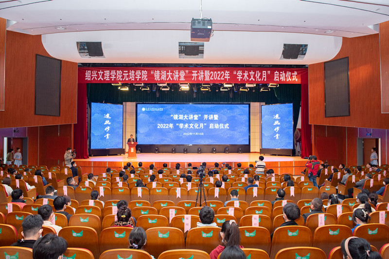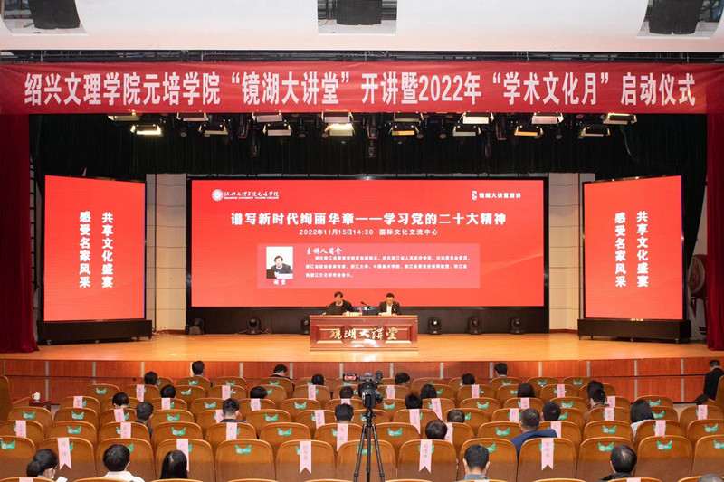 “感受名家风采,共享文化盛宴”。11月15日下午,学院“镜湖大讲堂”开讲暨2022年“学术文化月”启动仪式在国际文化交流中心报告厅举行。浙江省委宣传部原常务副部长,浙江省人民政府参事、咨询委员会委员胡坚,校党委书记汪俊昌,市委宣传部副部长俞正英,市社联副主席王晶,越城区委宣传部副部长、网信办主任、区社科联主席胡立钊,院党委书记梁瑜,绍兴市文化产业促进会会长叶访春等出席仪式。绍兴市文促会各会员单位负责人、文化产业研究院研究员,学院党政班子成员、全体中层干部、学院分院两级理论学习中心组成员、组织员、党支部书记和学生代表等参加活动。仪式由院长沈红卫主持。