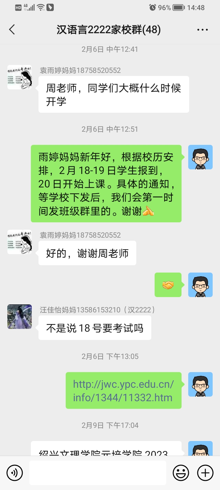 寒假中,许多班主任开展了线上家访活动。汉语言2222家校群在正月十六就热闹起来了,班主任周老师耐心细致地解答家长的问题,家长群已经成为学院开展家校联系的一个新路径。开学前,大一新生刘同学爸爸接到班主任章老师的电话后,激动地表示:“孩子大学的班主任是第一位给自己打电话的老师,除了感谢还很激动。小孩离家远,但是有这样负责的老师和学校,自己很放心。”