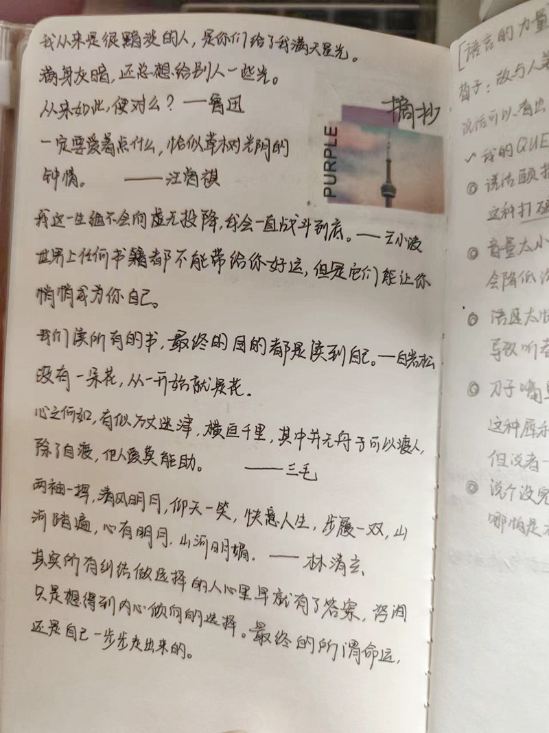 寝室的书架上,摆着几本对应沁倪意义非凡的笔记本笔记本内页中摘录了许多励志的句子情绪低落的时候,应沁倪喜欢做摘录、写日记形式进行自我对话,帮助自己快速找回状态这也是她日常给自己“充电”的方式之一“我喜欢审视自己,向内进行自我探索,每一段经历于我而言,都是一笔宝贵的财富。”在进行向内自我探索的过程中,应沁倪会对每一段经历进行阶段性的总结,回看自己的进步和不足,找到前行的下一个目标。