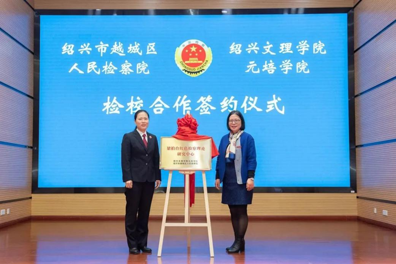 学院党委委员、副院长李黎和越城区人民检察院党组成员、副检察长章丹共同为“梁柏台红色检察理论研究中心”揭牌