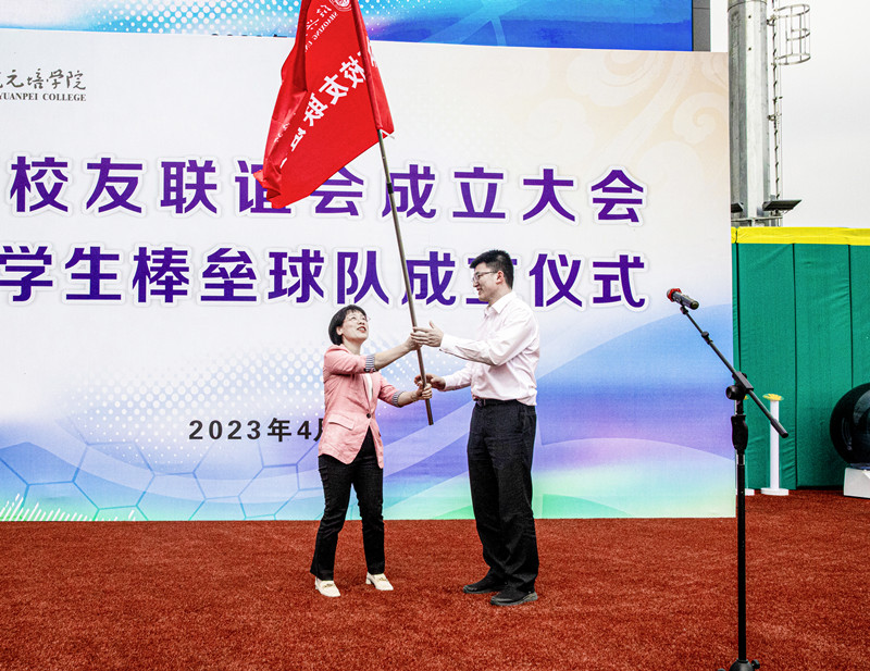 学院党委副书记、纪委书记俞国芬向体育校友联谊会授旗