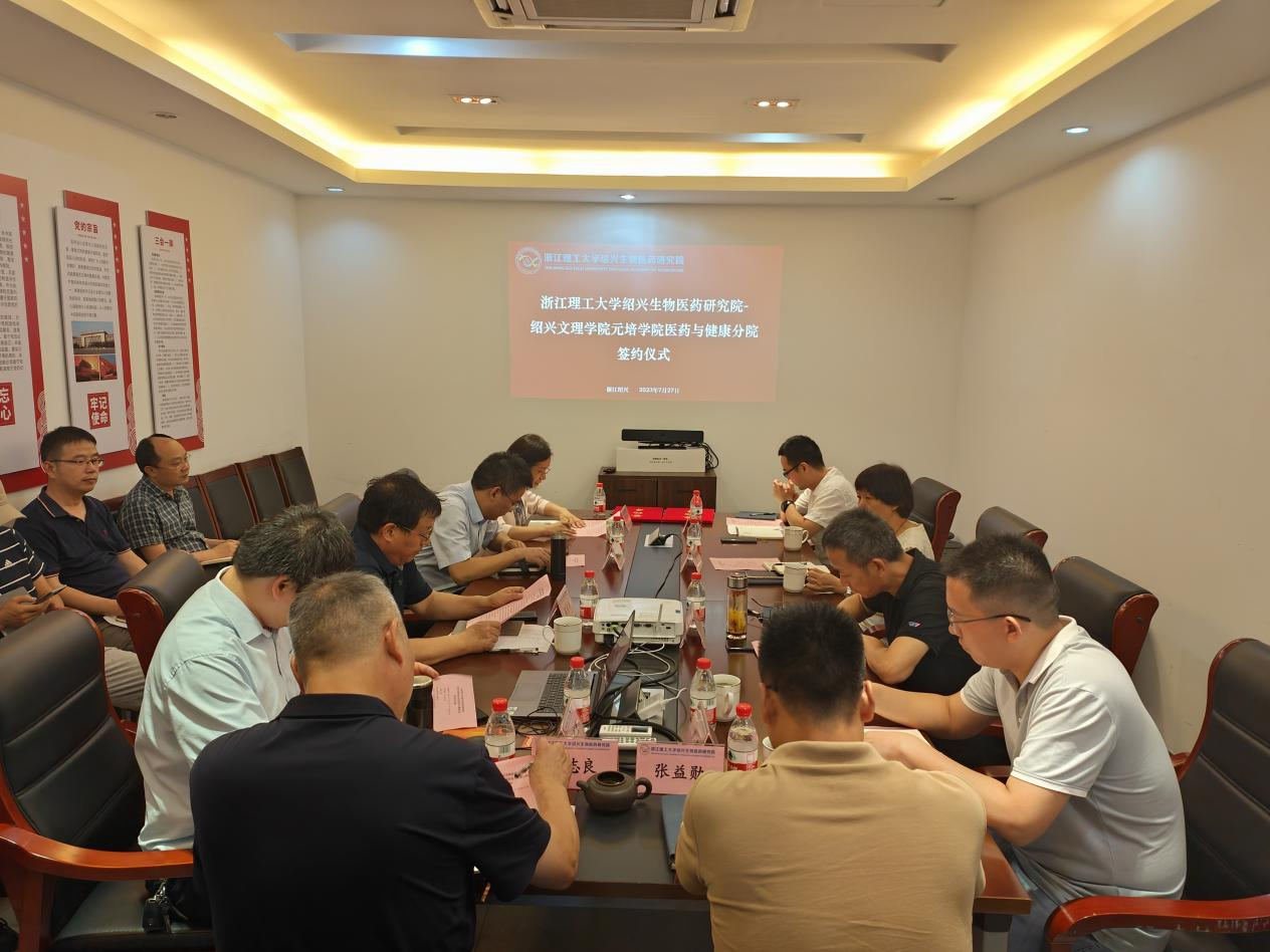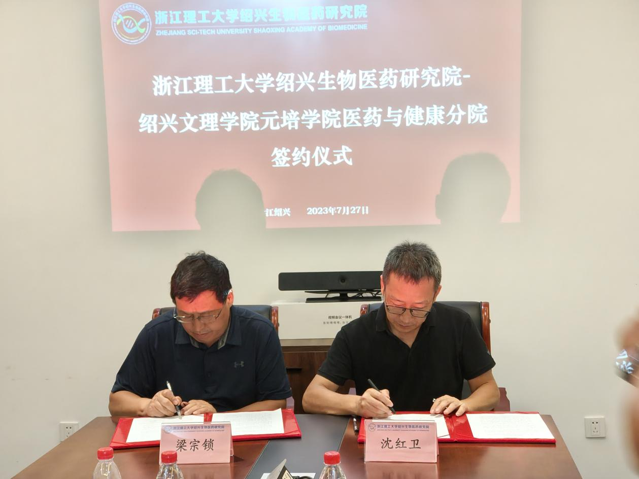 7月27日下午医药与健康分院与浙江理工大学绍兴生物医药研究院举行合作共建签约仪式。浙江理工大学生命科学与医药学院院长、绍兴生物医药研究院院长、支部书记梁宗锁,研究院副院长舒建洪陈剑清,党支部副书记俞梅兰、研究院各研究中心主任,太阳成集团tyc9728院长沈红卫、医药与健康分院政党负责人出席仪式。