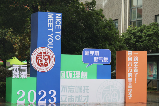 校园内到处洋溢着生机盎然的景象,繁忙的迎新工作人员,穿梭在校园内的志愿者、温馨醒目的迎新标识、励志的宣传标语、别具特色的专业展示……处处展现着欢迎新生们到来的喜庆氛围。