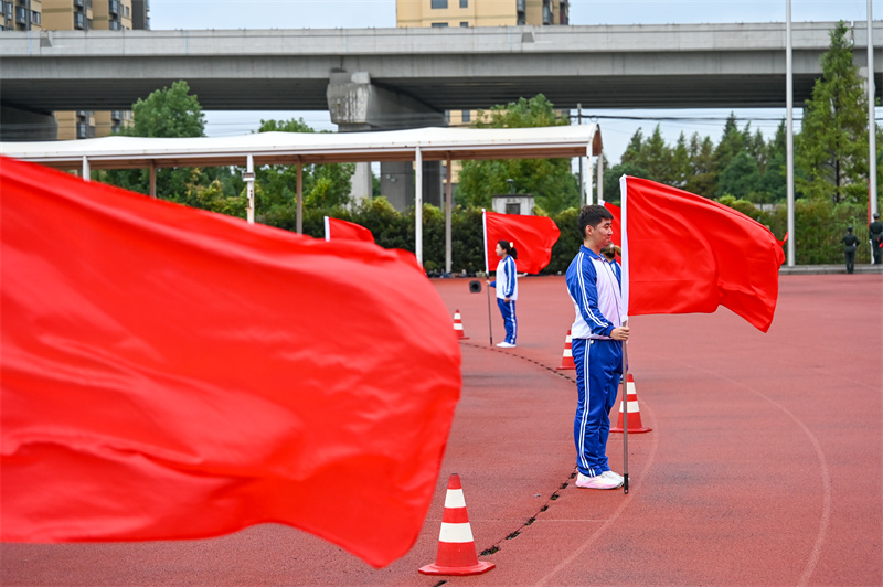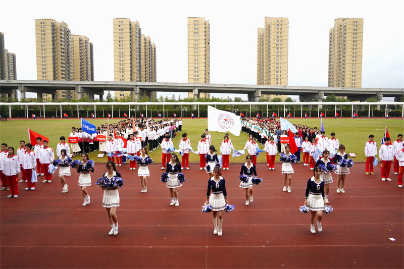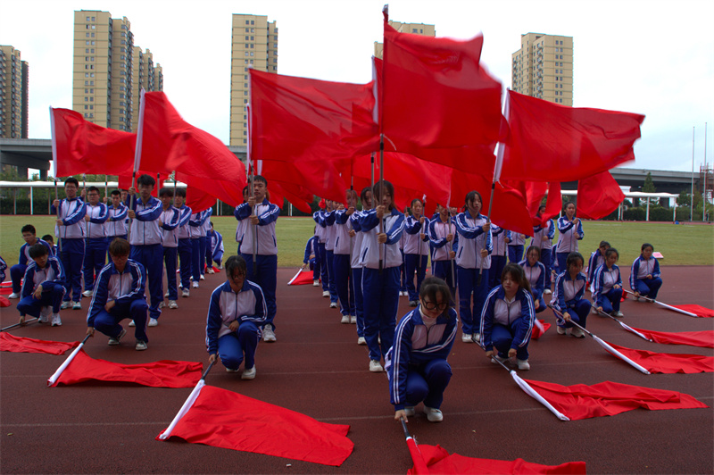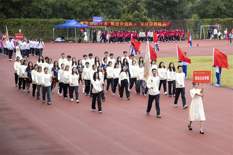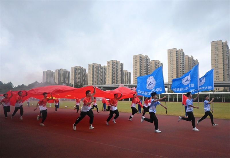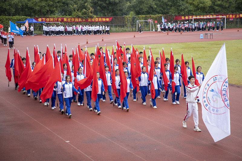 伴随着雄壮的运动员进行曲,国旗护卫队、院红旗队以及各二级分院方阵有序走来。迎着冉冉升起的五星红旗,全场师生庄严肃立,面向国旗行注目礼。