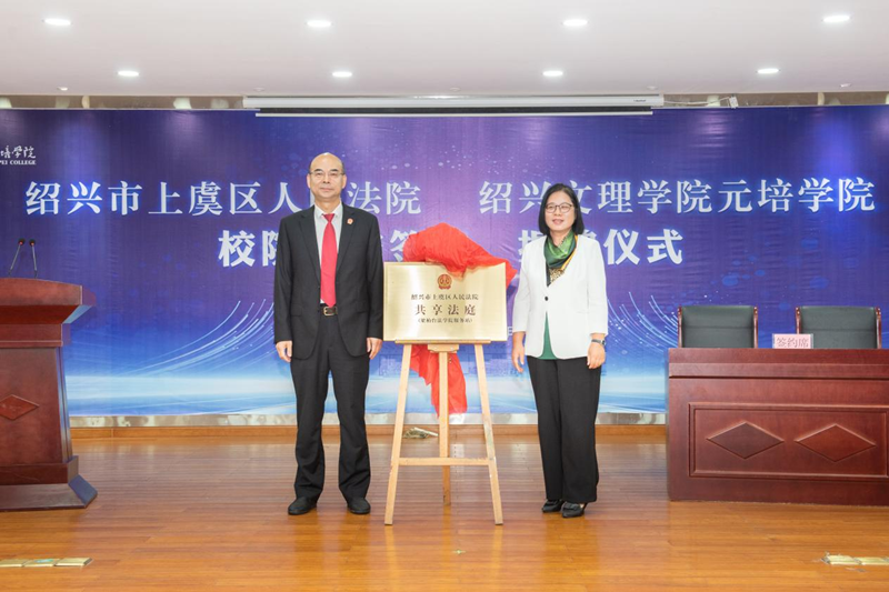 仪式上,沈红卫和朱淼蛟共同签订院校合作协议书,李黎和薛荣辉共同为“上虞区人民法院梁柏台法学院服务站——共享法庭”揭牌。
