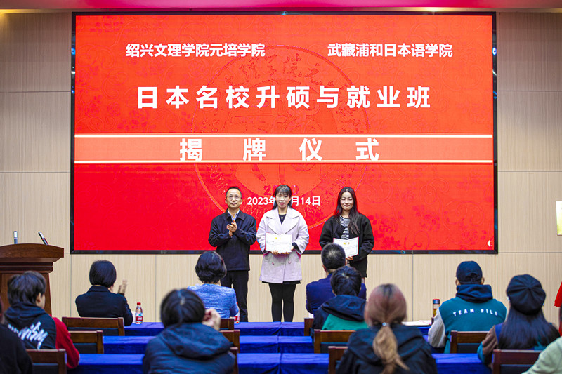 座谈会后,第三期“日本名校升硕就业班”成立揭牌仪式举行,陈均土和玉田英子共同为第三期“日本名校升硕就业班”揭牌。沈红卫为“日本名校升硕就业班”班主任何瑜和日语教师张彬颁发聘书。