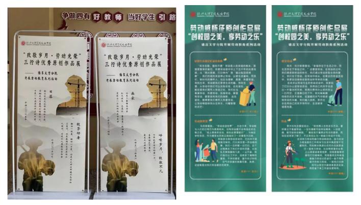 校园鹭湖是师生们喜爱的休憩之地,关注到鹭湖水体出现富营养化状况,药学和园林专业依托自身专业优势和校园环保志愿者协会,组建鹭湖环保小队,对鹭湖进行环境清理、水质监测和水体净化。队员们定期开展志愿活动,打捞水面悬浮物、捡拾周边垃圾、进行水质监测和水体净化。经过环保小队的长期维护,鹭湖水质恢复清澈。语言文学分院以学生志愿服务为载体,在三行诗、感悟征集活动中以文聚力,表达对各行各业劳动者的赞扬;在海报设计活动中以笔绘蓝图,将自己对新时代的劳模精神、劳动精神、工匠精神的理解注入作品;在主题朗读活动中“以声传情,以情带声”,抒发对劳动者的敬佩之情;在摄影活动中以光影为墨,记录劳动者辛勤的身影;在原创推文活动中,图文并茂宣扬劳模精神。