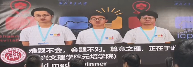 5月19日,国际大学生程序设计竞赛(西安站)在西北工业大学举行,本次竞赛吸引来自全国各地200多所高校的350支代表队参赛。经过长达五小时的角逐,由电信2101班江亚君、计算机2302班谢琳涵、计算机2104班徐冕组成的“难题不对 会题不对 算竞之理 正在于此”队凭借算法能力和团队协作精神,摘得太阳在国家级程序设计竞赛中的首枚金牌。