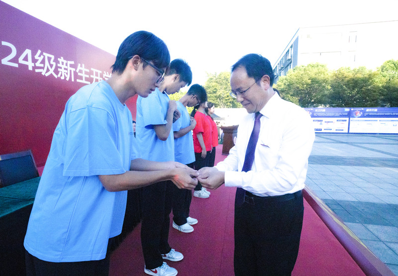 校党委委员、院党委书记梁瑜向2024级新生代表赠送院徽和书籍《习近平与大学生朋友们》,殷切期望同学们厚植家校情怀,牢记教诲和嘱托,坚守理想,挺膺担当,扎根基层,不懈追求卓越之路,书写青春精彩华章。