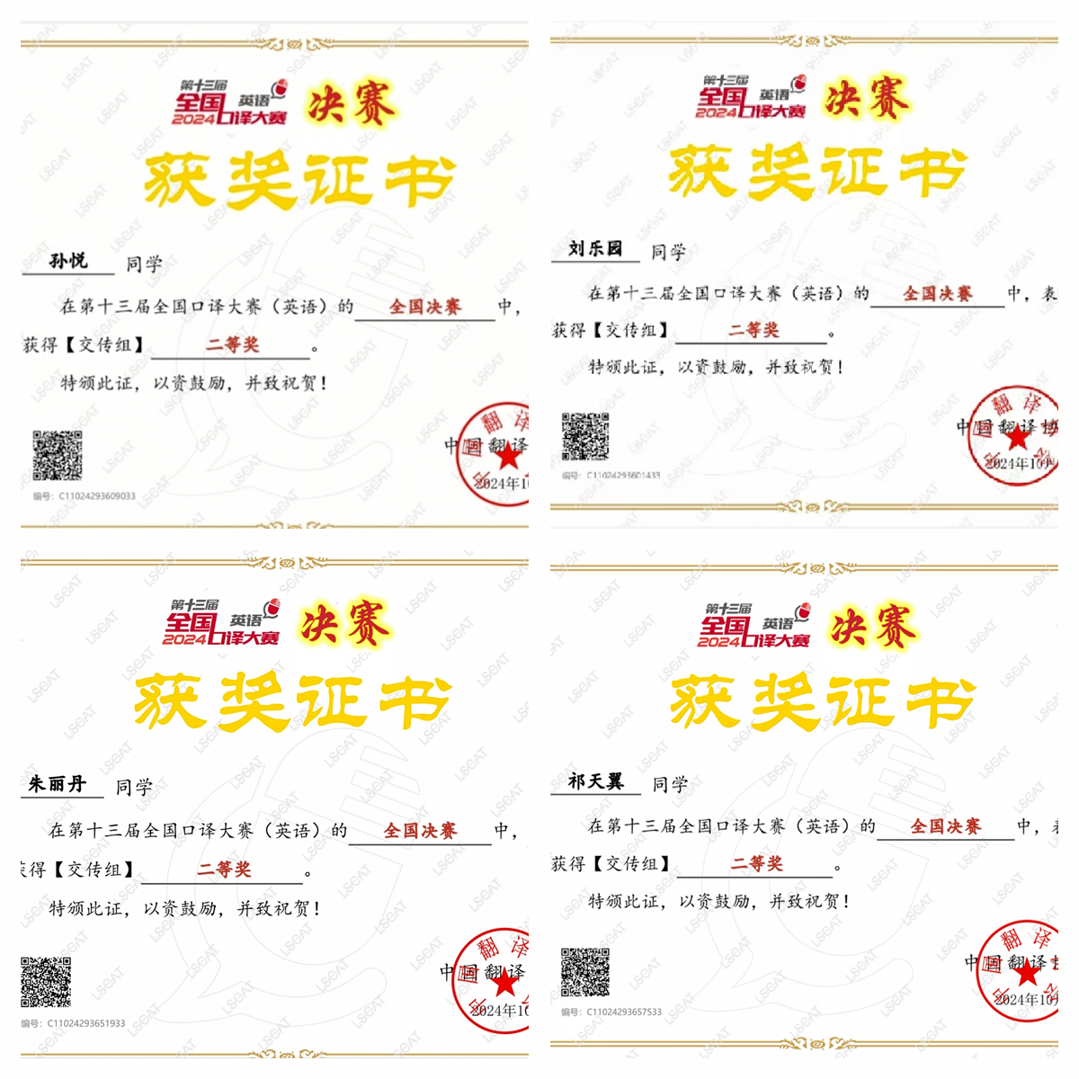 近日,第十三届全国口译大赛决赛落下帷幕太阳英语专业孙悦、刘乐园、朱丽丹、王鲁璇同学以及翻译专业祁天翼同学获全国交传组二等奖,余裕龙、陈怡玲、陈佳燕、夏丽莎等同学获优秀奖。此外,我选手排位再创新高,在全国两千余名参赛选手中,孙悦排名110,刘乐园排名157。