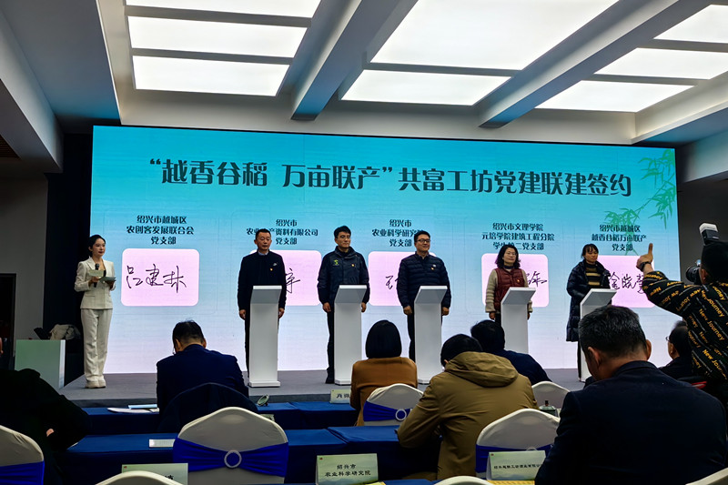 活动现场,“越香谷稻 万亩联产”共富工坊党建联建签约仪式上,建筑工程分院学生第二党支部绍兴市农业科学研究院、绍兴市农业生产资料有限公司、绍兴市越城区农创客发展联合会、越香谷稻万亩联产共富工坊等党支部共同签署协议