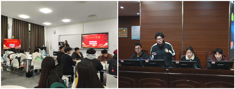 在校内,分院以赛促学,掀起宪法学习热潮,先后开展宪法知识竞赛和“法学杯”辩论赛,吸引众多法学学子参与。国家宪法日当天,宪法晨读活动与宪法宣誓仪式先后举行,同学们以饱满的热情,高昂的声音,展现对宪法的崇高敬意与高度认同。“宪趣同行,章显法韵”主题游园活动通过精心设计游戏环节,营造尊崇宪法、学习宪法的浓厚氛围。此外,还联合民生银行绍兴分行开展宪法宣传交流活动。