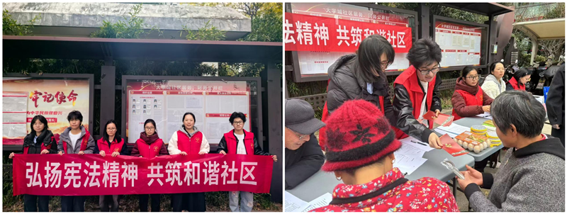 在校外,分院联合相关社区开展“宪法宣传”活动,在各个社区设置宣传点,摆放宣传海报,发放国家宪法日知识宣传册以及宣传试题,带动居民学习宪法,普及宪法知识,并积极参与由绍兴市司法局、绍兴市普法办等组织的宪法宣传月活动,共同营造法治氛围。
