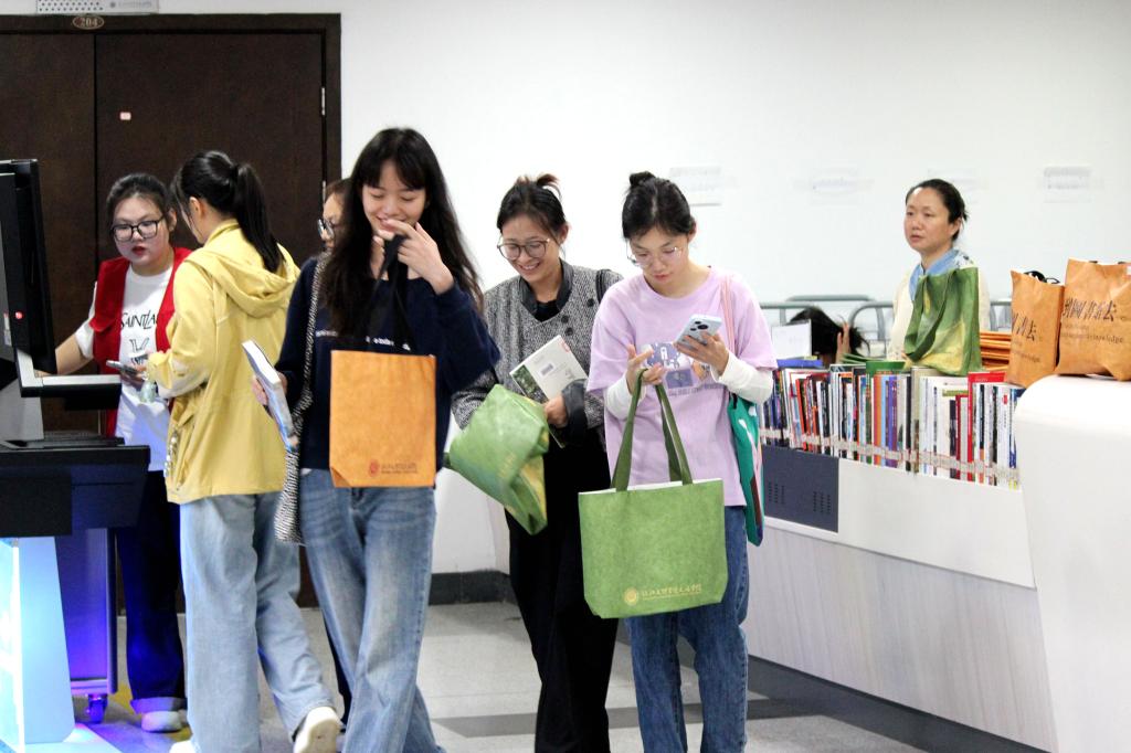 活动现场,手持5本图书高举战利品的学生正打卡留念。“原本计划借2本,但看到这个帆布袋瞬间燃起斗志。”法学院的王同学说道,“这个书袋不仅是战利品,更是督促我们阅读的‘军令状’”。在借阅区,还有读者自发形成“书单交流会”,从社科经典到科幻小说,现场碰撞出无数阅读火花。