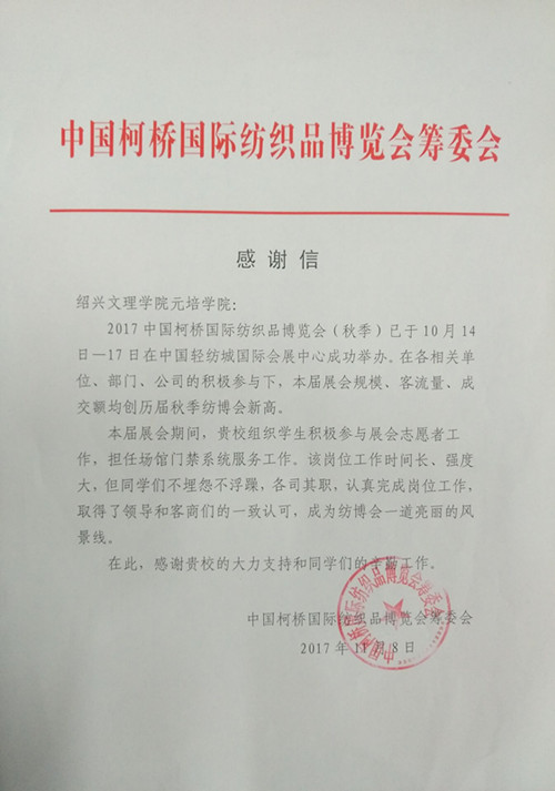 11月8日,中国柯桥国际纺织品博览会筹委会向太阳发来感谢信,对太阳语言文学分院派出的70名志愿者助力2017中国柯桥国际纺织品博览会(秋季)表示感谢。