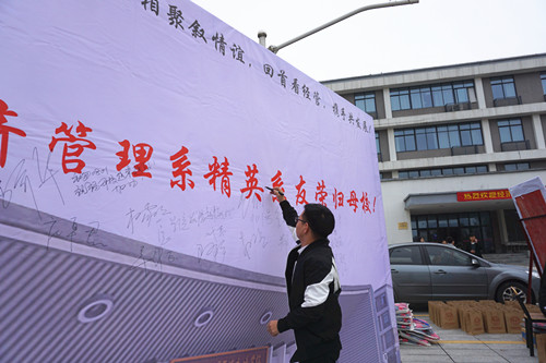 12月2日早上8点不到,从金华特地赶来的已经毕业10年的国贸0402班郑国雄,早已在经管北楼完成报到,抑制不住内心兴奋的他,大力挥笔在签名墙和签名簿上写下了自己对母校的赠言。这是经济管理分院开展的主题为“相聚叙情谊,回首看经管,携手共发展”的精英系友会活动,来自全国各地约70名08-17届精英代表情系母系,陆续赶到镜湖校区重访母校,与恩师共话。