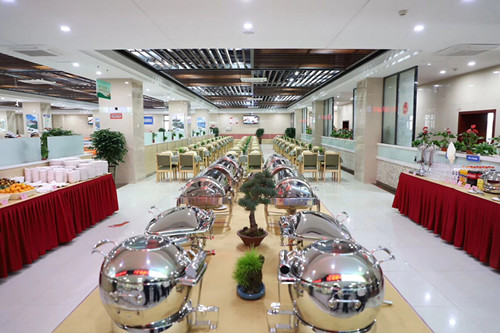 本次大会专用餐厅为兴越楼二楼教工餐厅,就餐环境采用国际化标准,排列有序的桌椅、绿色多样盆景布置、整齐简洁台面设计、统一墨绿与浅黄餐具搭配,让人眼前一亮、耳目一新。40个中西菜品、小吃甜点主食、甜点、水果、饮料一应俱全,每道美味佳肴都经过严苛筛选、精心烹制而成,各式食品中英文标签标注。香煎牛排、梭子蟹年糕、意大利炒面、蛋黄酥等美食更是赢得了一大票“粉丝”。嘉宾纷纷点赞。据悉,为确保大会各项服务工作顺利开展,资产经营公司就提前组织召开专题协调会,明确用餐菜品、环境布置、人员配备、餐具配置等各项工作安排,要求餐饮、商贸等相关部门各司其职、各尽其责,做好餐饮保障,提供优质服务。