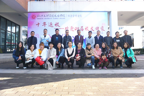 分院党总支负责人对返校校友们表示欢迎,希望他们心系母校,常回家看看。在学工一线老师带领下,校友们参观校园和创新创业学院,对学院优美的校园环境和良好的创业条件纷纷点赞。参观结束,校友们穿上分院定制的毕业文化衫,参加毕业十周年主题班会,在教室中张贴的一张张寝室与班级合照中重温大学四年的青春岁月,分享毕业后各自走过的十个春夏秋冬。临行前,校友们在分院和图书馆前合影留念。