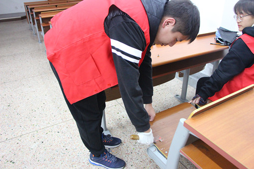 活动期间,尽管天空下着雨,但志愿者们的热情与斗志依然昂扬。大家身着统一服装,分工明确,拿起小铲子、抹布等工具,各自奔赴负责区域,从教室内到教室外,从卫生间到楼道,一丝不苟进行清理与除藓。经过两个下午的奋斗,南北区室外场所和1至11幢教学楼内的牛皮藓基本铲除,教学楼的墙面、桌椅都焕然一新,室外也恢复了整洁干净的面貌,不仅美化了校园环境,同时也增强了志愿者们的参与感与使命感,发挥了党员先锋模范作用与奉献精神,进一步推进文明校园建设工作。