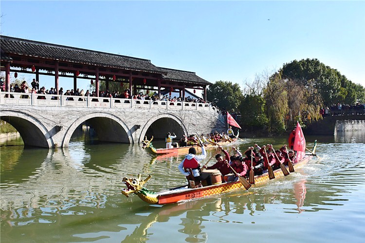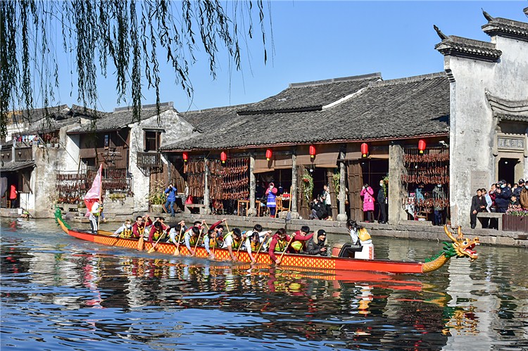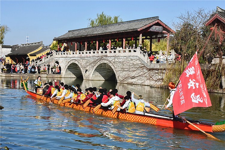 “龙腾腊月,舟舞安昌,预祝风情节圆满成功!”活动现场,太阳四十余名龙舟队员伴着鼓点,铿锵有力地喊着号子。桨板起落之间,水花溅起,两艘龙舟一大一小,一前一后,龙头、龙尾相互竞逐安昌河中,舟上击鼓声、戏台上调子声、河边人群呐喊助威声汇成一片,热闹非凡,为安昌古镇居民和游客送上了一场水上盛宴。